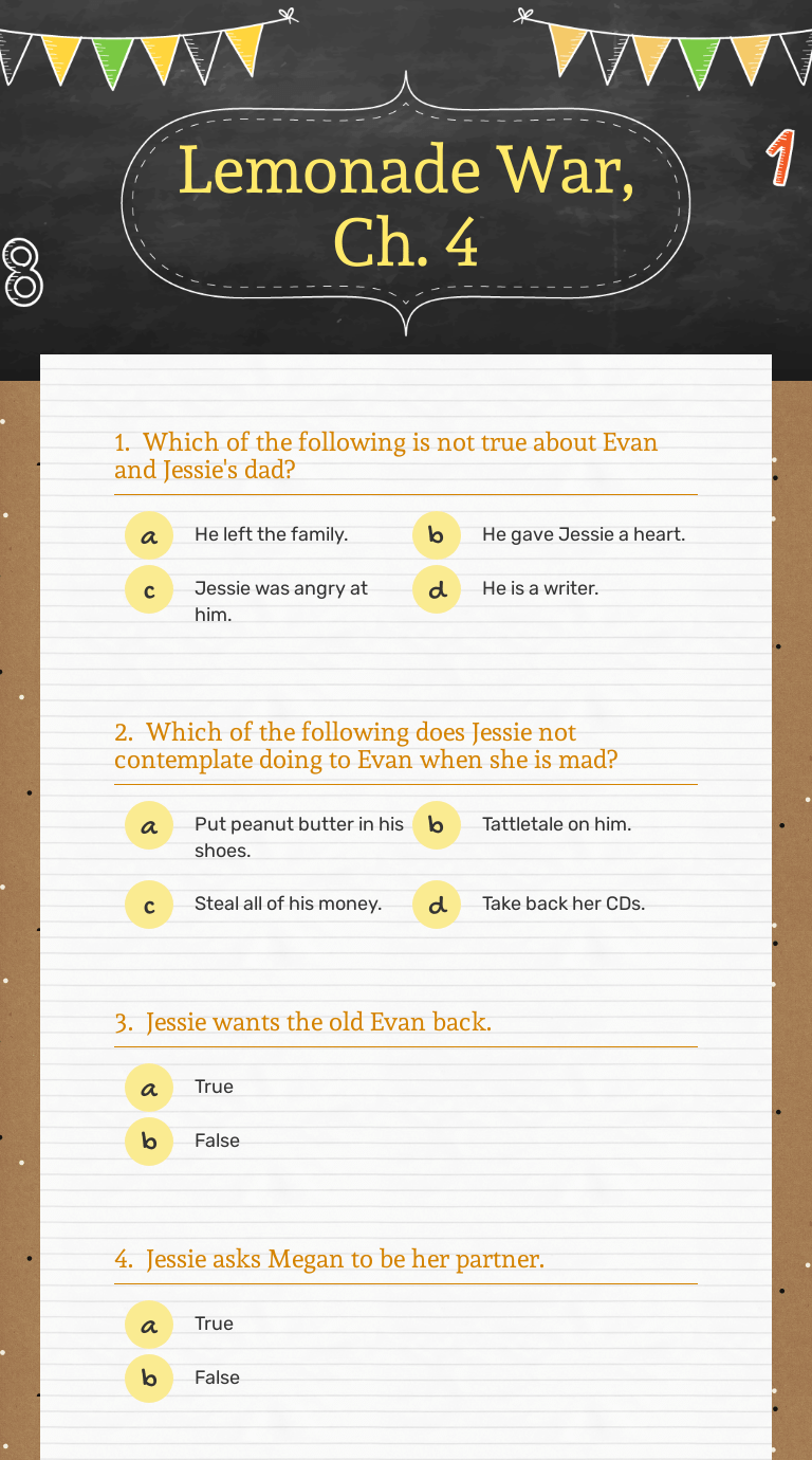 The world is a thirsty place, he thought. The lemonade war features two protagonists in alternating chapters. Use the activities in this asset to bring further meaning. The lemonade war tells the story of an exciting summer spent by a loving but competitive pair of siblings, evan and jessie treski. Reading comprehension online worksheet for 4th. By jacqueline davies • book 1 of the lemonade war series. At the end of the summer, . Students will record this information into their lap books using the attached worksheet. 'the lemonade war' is a book written by jacqueline davies about dueling lemonade stands. The lemonade war by jacqueline davies is the story of sibling rivalry and the road to entrepreneurship at its finest. Lemonade war t/f, multiple choice, extended response . Novel study on the lemonade war part ii …. Lemonade war novel hyperdoc unit and additional resources to support teachers, parents and students during social isolation.